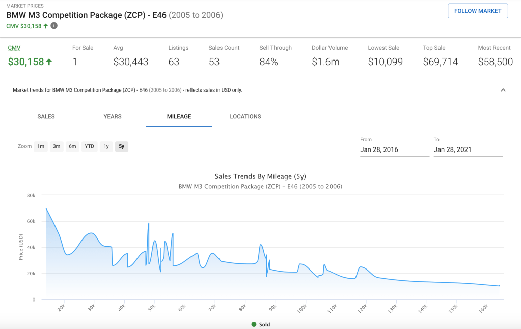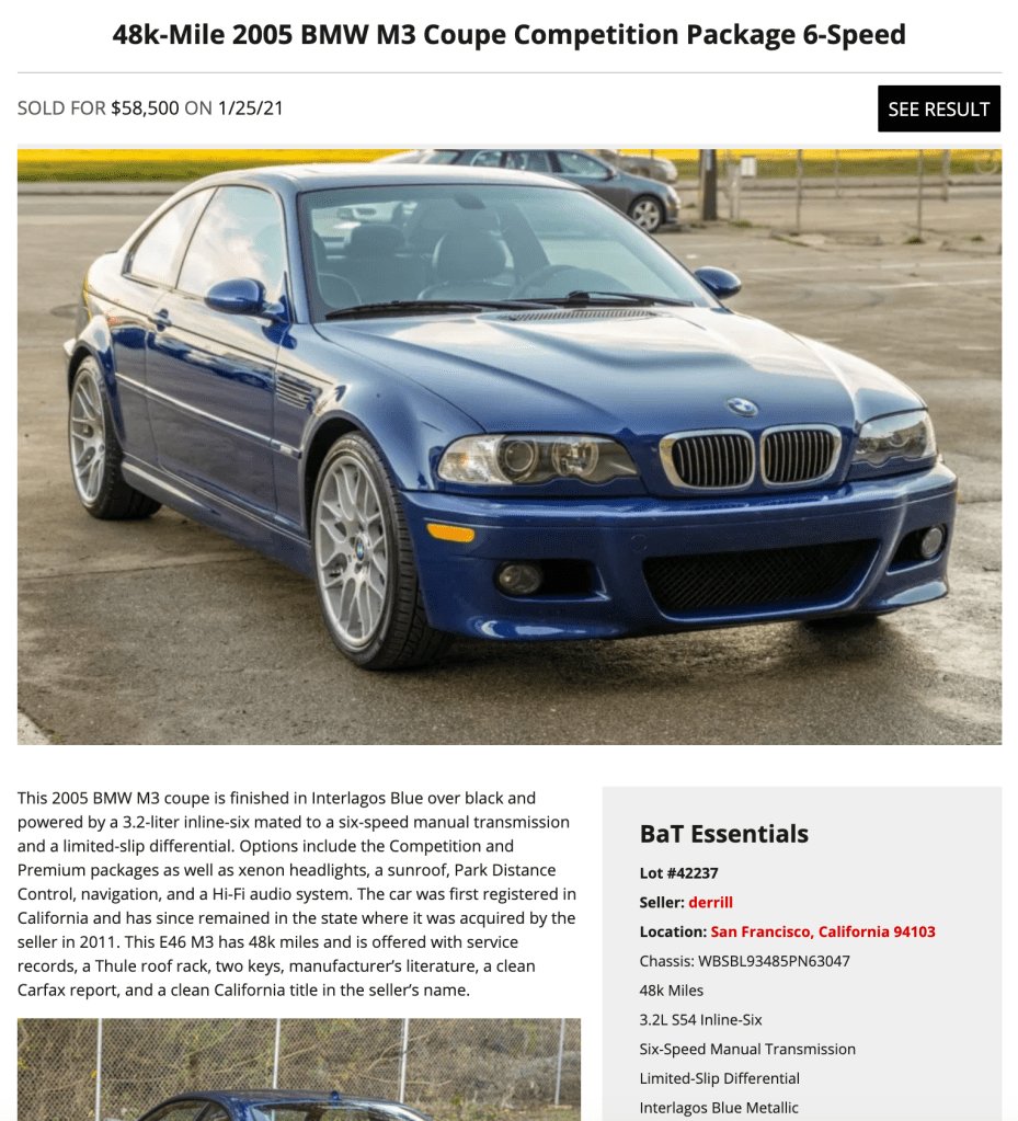 The E46 M3 is at the top of almost every enthusiast’s best sports cars ever made list. Looking ahead, the midrange examples will slowly gain wear and mileage, and poor examples will continue to wither away into parts. This inherently increases the value of mint condition examples such as the numerous $50,000+ E46 M3’s sold by reputable analog BMW specialist, Enthusiast Auto Group. It would not be surprising if the E46 M3 follows in the footsteps of its older sibling, the E30 M3, and see prices climb into the six figure range over the next five years. If you were to go for one, this 2006 BMW E46 ZCP M3 with 34k miles, the manual transmission, and drool-worthy full alcantara interior would certainly be the one we’d look at first. Anyone have an extra $46,000 laying around?